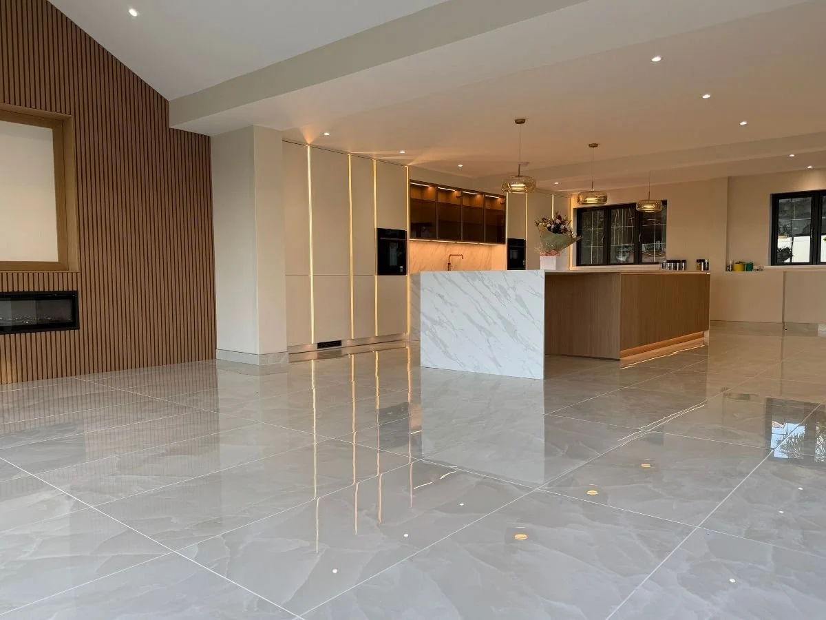 Finished with 20mm Cimstone Calacatta Lucia worktops featuring twin waterfall ends, this kitchen blends precision craftsmanship with refined materials. Premium Neff appliances, a Bora X Pure vented induction hob, and a Quooker tap with Cube complete the design bringing together cutting-edge functionality and timeless sophistication.