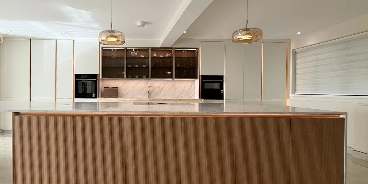 We designed, supplied and installed this stunning Hacker Systemat kitchen, combining clean white cabinetry with fluted Elegant Oak island fronts for a striking contrast of tone and texture. The illuminated brushed channel handles and bronze glazed display units add depth and warmth, creating a space that feels both modern and inviting.