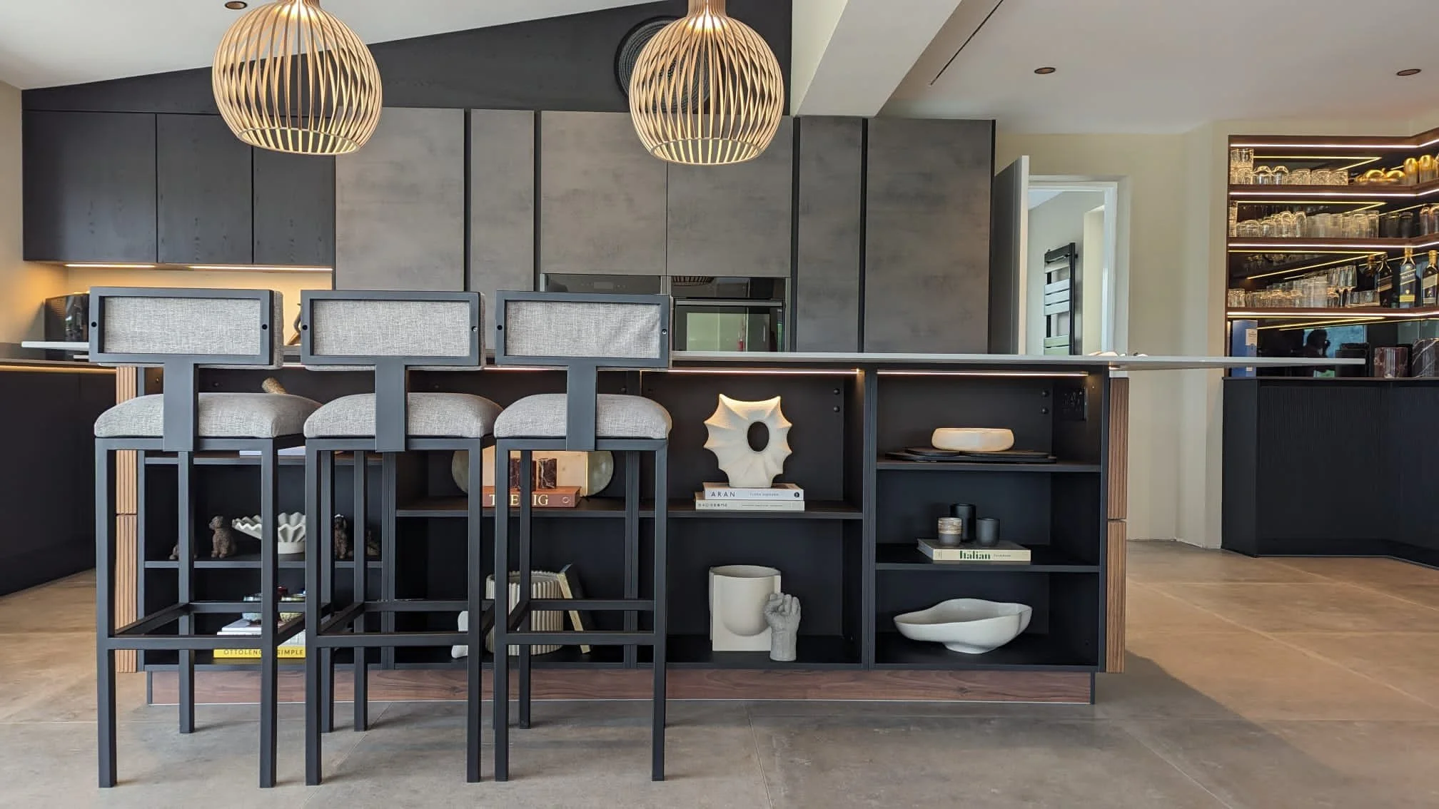 A striking Masterclass H-Line kitchen featuring a 3.5m island in Deco Linear Twilight, Corian work surfaces, and Neff appliances, seamlessly installed in collaboration with the client’s contractor and architect.