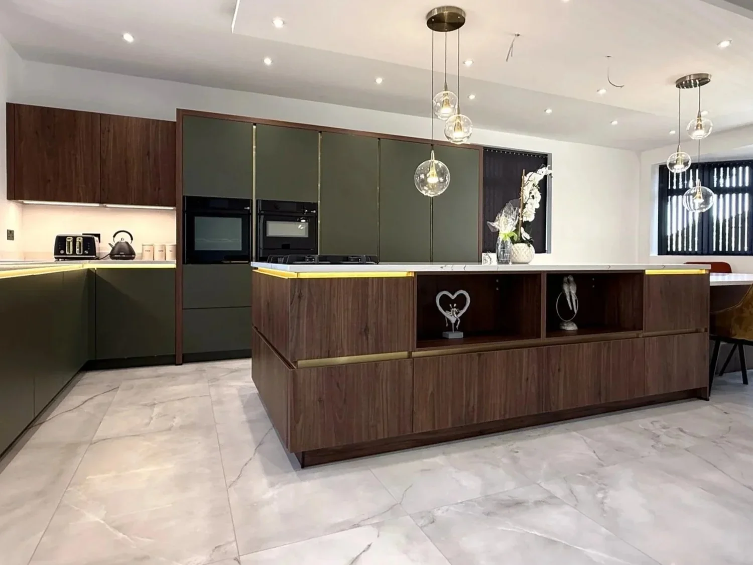 30mm Cimstone Calacatta Venato quartz work surfaces with drop-down dining area